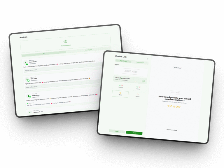 Create beautiful, branded review landing pages that guide customers to leave reviews on your preferred platforms. Add your logo, choose rating styles (stars, hearts, thumbs), and generate QR codes for offline customer touchpoints.